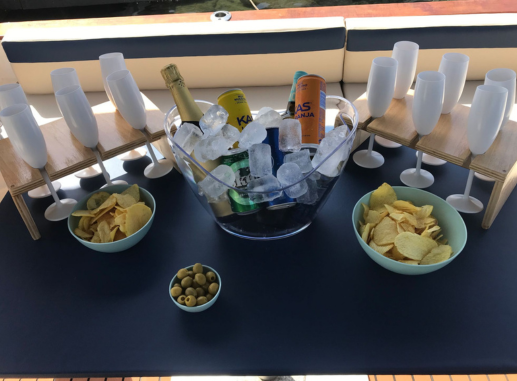 Tu aventura comienza con un cordial recibimiento, donde te esperan bebidas de bienvenida que incluyen cava, vino, refrescos, cerveza y agua, acompañados de un surtido de snacks: patatas, aceitunas y galletitas saladas, creando el ambiente perfecto para iniciar el viaje.