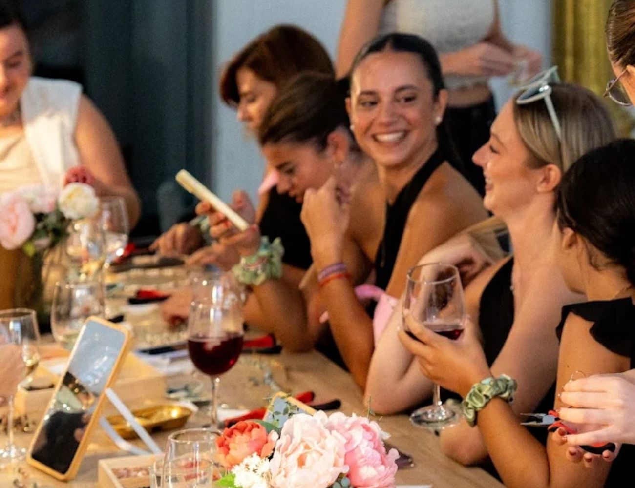El espacio del taller favorece la comodidad y la interacción del grupo. Música suave, una mesa llena de colores y materiales, y una dinámica cercana ayudan a que cada participante explore diferentes opciones sin presión. La actividad permite conversaciones espontáneas, bromas y momentos que añaden carácter a la despedida.