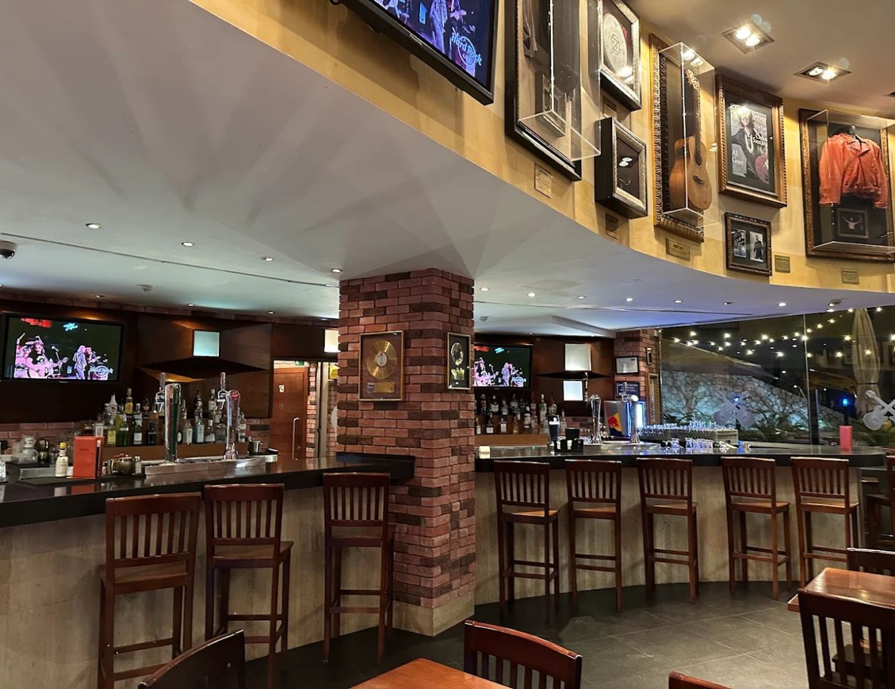 La decoración interior está cargada de historia musical, con piezas auténticas de artistas reconocidos y un diseño que envuelve a los visitantes en una atmósfera vibrante. Cada rincón transmite la energía del rock, logrando que la experiencia de la cena vaya más allá de lo gastronómico para convertirse en un espectáculo visual y sensorial.