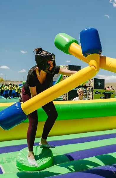 La carrera de caballitos es pura comedia visual, con participantes avanzando sobre caballitos hinchables a toda velocidad. Los gladiadores aportan un combate amistoso sobre una base inestable, donde el objetivo es derribar al rival sin perder el equilibrio.