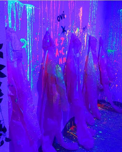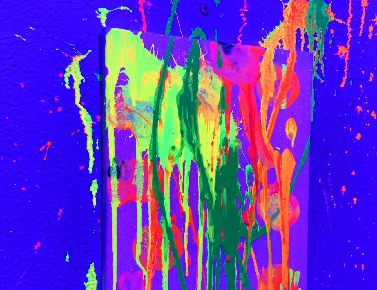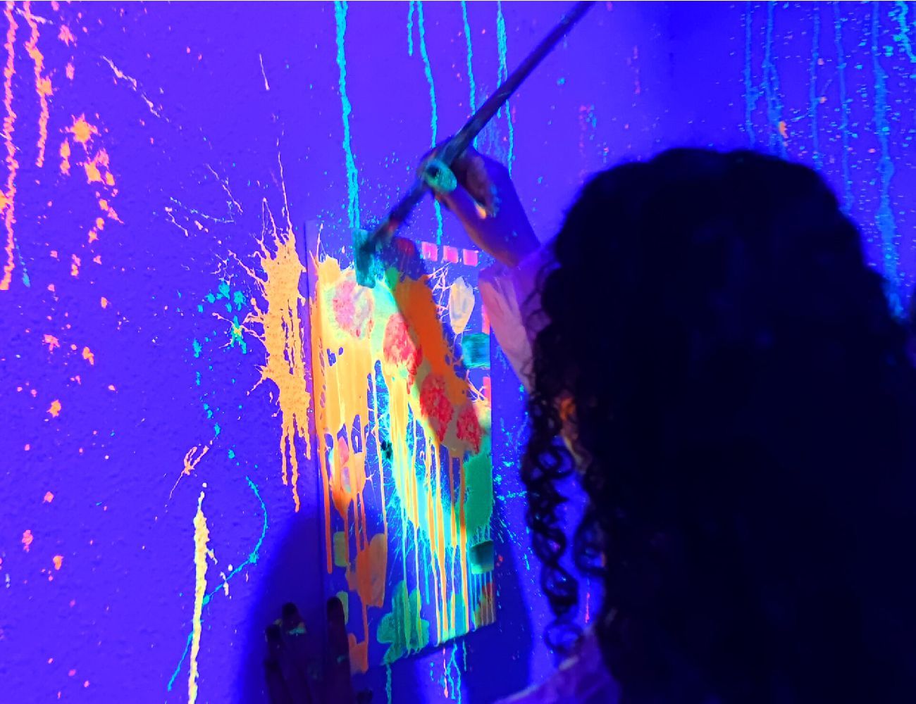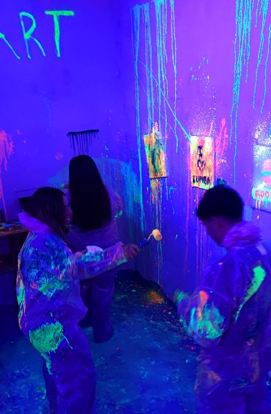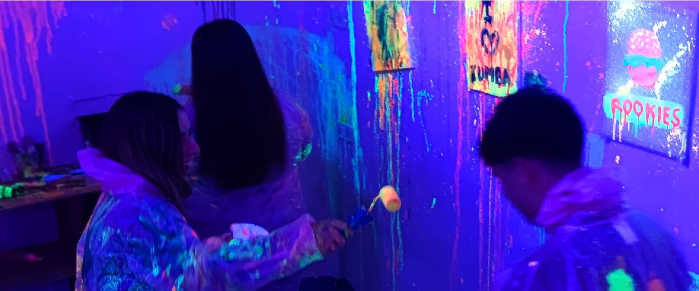 Las luces crean un efecto visual increíble: los colores brillan, las salpicaduras destacan y cada trazo cobra vida. Es imposible no disfrutar mientras pintas, bailas y compartes el momento con tus amigos o amigas.