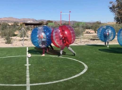 En la zona de Mojácar, en Turre, tenéis este fútbol burbuja esperando a que lo paséis genial. El bubble soccer tiene las mismas reglas que el fútbol normal, con la «pequeña» diferencia de que jugaréis metidos en una burbuja hinchable. Tendréis completa libertad de chocar entre vosotros, ya que la burbuja os sirve de protección y seguridad, por lo tanto podréis rebotar entre vosotros sin haceros daño. Aquí se necesita más maña que fuerza y hasta el pichichi de vuestro equipo tendrá problemas para meter gol.