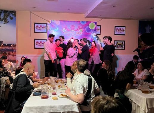 No se puede poner en duda que nuestro restaurante karaoke en el centro de la ciudad es el restaurante espectáculo más original de Madrid. En él, conoceréis a gente única y a animadores muy divertidos, realizaréis pruebas durante la cena que harán que os partáis de risa y cantaréis al ritmo de los mejores hits del momento en nuestro karaoke.